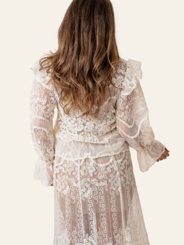 Blouse in sheer lace fabric with an embroidered pattern. Designed with a high neckline and button closure at the front. The lace pattern creates panels and curved details across the chest. The blouse has long sleeves with volume and wide cuffs. Small ruffles at the shoulders and a scalloped hem follow the structure of the lace fabric.