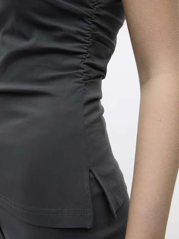 Ærmeløs top med rynkeeffekt i siderne. Glat, let materiale med en smule skinnende finish. Rund hals og elastiske læg i siderne, der skaber rynkeeffekt. Indsnit ved barmen. Slank pasform.
