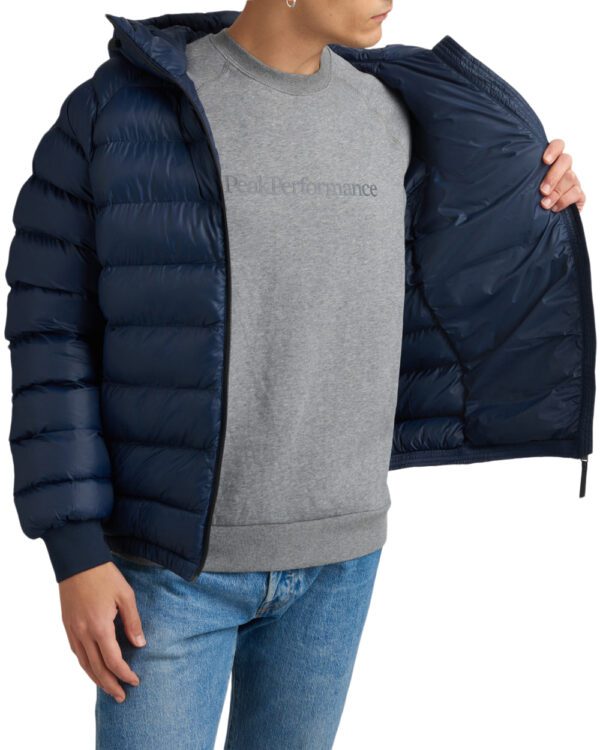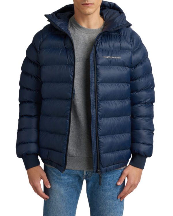 Padded and warming jacket with nice volume from Peak Performance. The jacket has horizontal panels that holds the padding in place and has two side pockets with zips, hood with drawstring, cuffs at the wrists and an embroidered logo on the chest and sleeve.